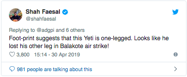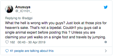 Many people pointed out the fact that there was only one footprint in the pictures, asking if this meant the Yeti was one-legged, while others asked if their account had been hacked. Others couldn’t believe they had tweeted such a thing, asking if they were pranking their followers.